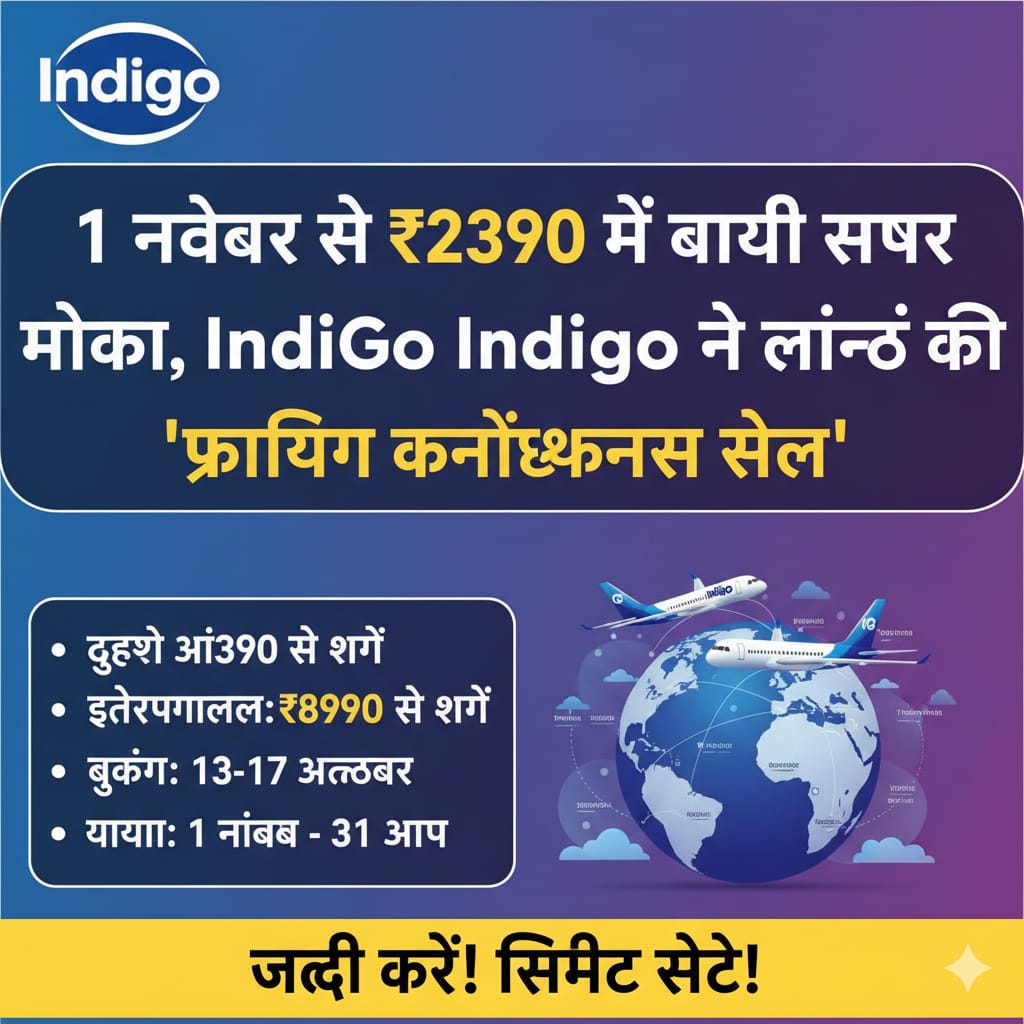 नई दिल्ली: देश की सबसे बड़ी एयरलाइन इंडिगो (IndiGo) ने यात्रियों को बड़ा तोहफा देते हुए ‘फ्लाइंग कनेक्शन्स सेल’ (Flying Connections Sale) की घोषणा की है। इस सेल के तहत यात्री मात्र ₹2,390 की शुरुआती कीमत पर हवाई सफर का लुत्फ उठा सकेंगे। यह ऑफर 1 नवंबर 2025 से शुरू होने वाली यात्राओं के लिए मान्य होगा।