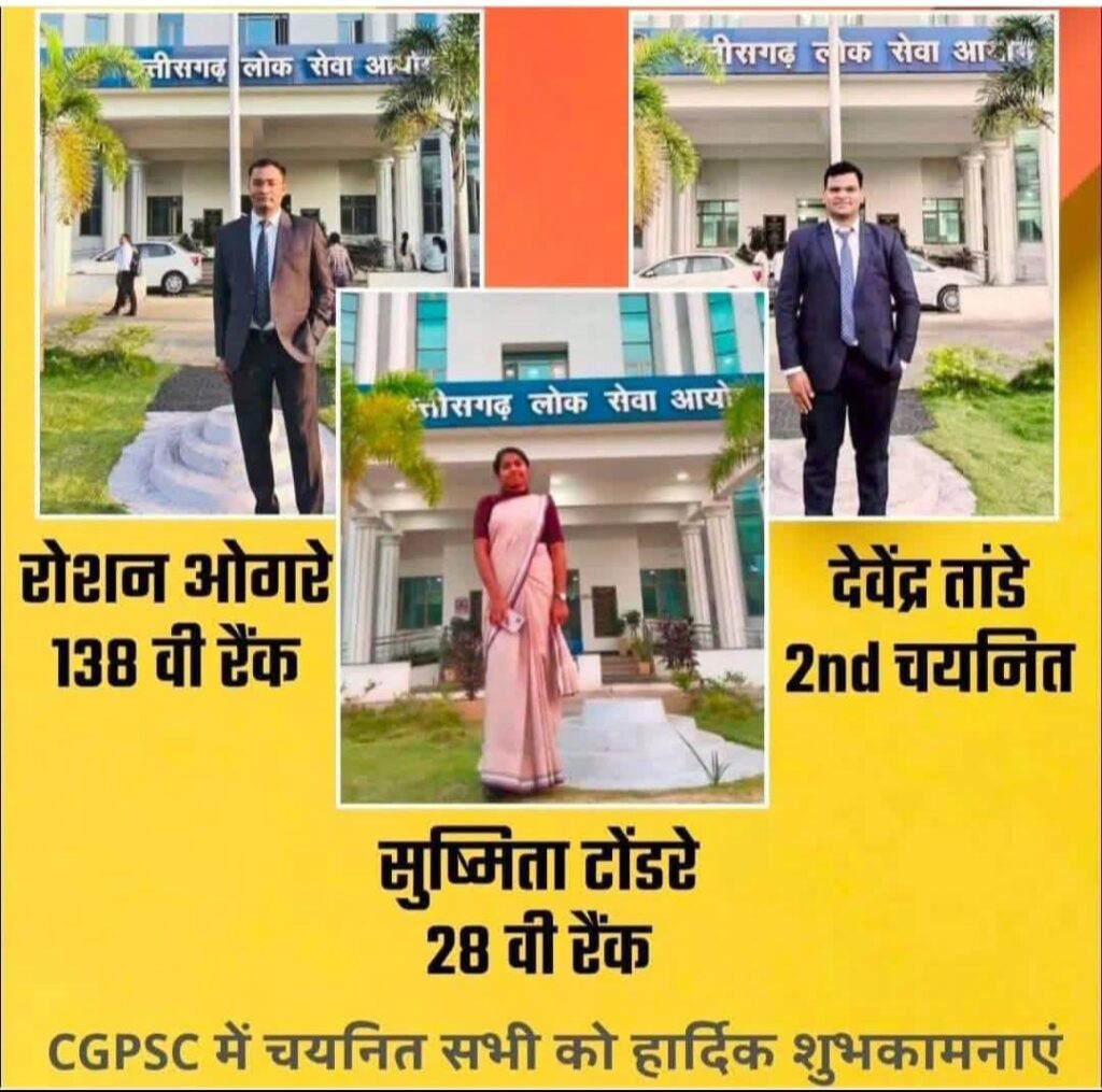 बेमेतरा। छत्तीसगढ़ लोक सेवा आयोग (CGPSC) द्वारा 21 नवंबर 2025 को घोषित किए गए परीक्षा परिणामों में बेमेतरा जिले के चार होनहार युवाओं – दो युवक और दो युवतियों ने शानदार सफलता हासिल कर जिले का नाम रोशन किया है। इन प्रतिभाशाली उम्मीदवारों ने अपनी मेहनत और लगन से प्रशासनिक अधिकारी बनने की दिशा में कदम बढ़ाया है।