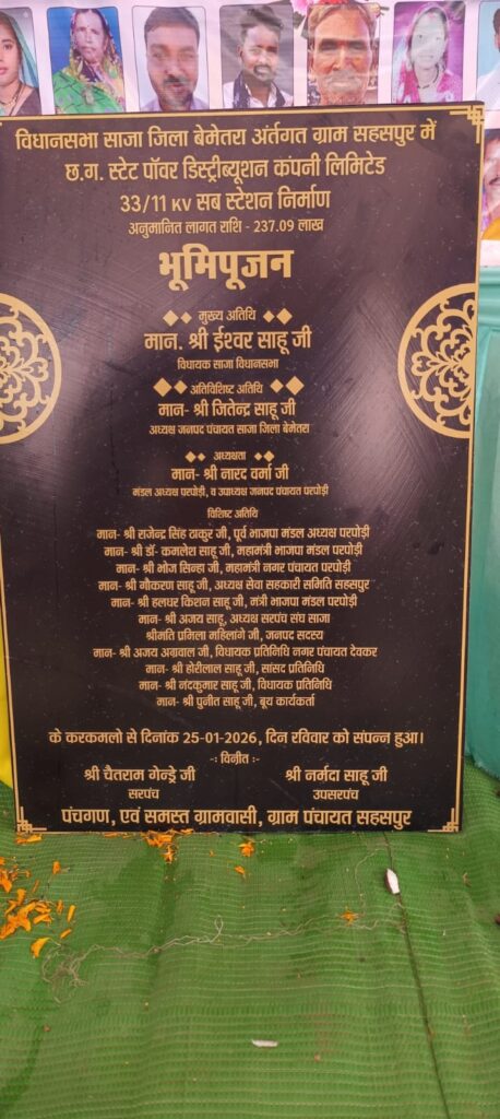 बेमेतरा/साजा: साजा विधानसभा क्षेत्र के अंतर्गत आने वाले ग्राम सहसपुर में विद्युत व्यवस्था को सुदृढ़ करने के लिए एक बड़ी सौगात मिली है। छत्तीसगढ़ स्टेट पॉवर डिस्ट्रीब्यूशन कंपनी लिमिटेड द्वारा यहाँ 33/11 KV सब स्टेशन का निर्माण किया जा रहा है, जिसका भूमिपूजन रविवार, 25 जनवरी 2026 को धूमधाम से संपन्न हुआ।