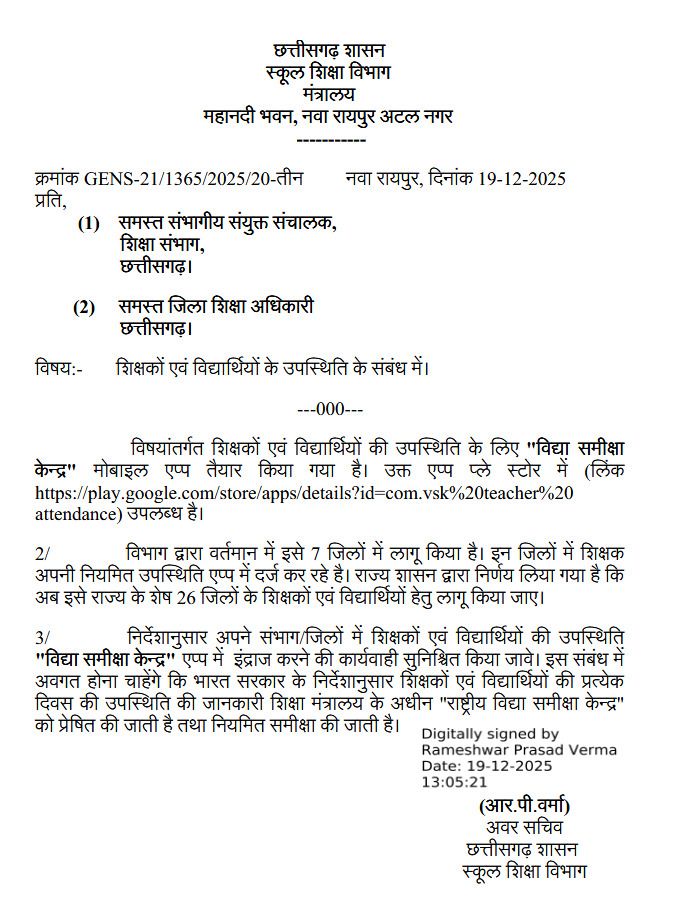 विभाग द्वारा जारी आदेश के अनुसार, उपस्थिति दर्ज करने के लिए “विद्या समीक्षा केंद्र” (Vidya Samiksha Kendra) मोबाइल ऐप और वेब पोर्टल का उपयोग किया जाएगा। गौरतलब है कि यह व्यवस्था पहले प्रायोगिक तौर पर प्रदेश के 7 जिलों में लागू की गई थी। वहां मिले सकारात्मक परिणामों और फीडबैक के बाद अब इसे राज्य के शेष 26 जिलों में भी अनिवार्य कर दिया गया है। इस प्रकार अब छत्तीसगढ़ के सभी 33 जिलों में डिजिटल अटेंडेंस सिस्टम प्रभावी होगा।