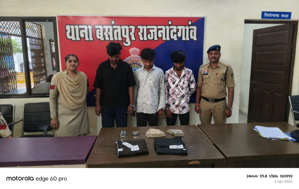 राजनांदगांव। जिले की बसंतपुर पुलिस ने सिगंदई स्थित एक कपड़ा दुकान में हुई चोरी के मामले का 24 घंटे के भीतर खुलासा कर दिया है। पुलिस ने मामले में तीन शातिर आरोपियों को गिरफ्तार किया है, जिनसे चोरी का माल और घटना में प्रयुक्त मोटरसाइकिल बरामद कर ली गई है। पकड़े गए आरोपियों में से एक के खिलाफ पहले से ही कई गंभीर आपराधिक मामले दर्ज हैं।