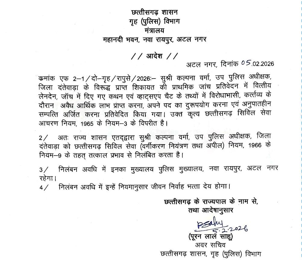 रायपुर। छत्तीसगढ़ शासन ने कड़ा रुख अपनाते हुए दंतेवाड़ा में पदस्थ डीएसपी कल्पना वर्मा को तत्काल प्रभाव से निलंबित कर दिया है। गृह (पुलिस) विभाग द्वारा जारी आदेश के अनुसार, कल्पना वर्मा पर पद के दुरुपयोग, अवैध आर्थिक लाभ और बेहद संवेदनशील खुफिया जानकारी साझा करने जैसे गंभीर आरोप लगे हैं।