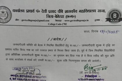 खबर का असर: साजा महाविद्यालय का अतिरिक्त जनभागीदारी शुल्क ₹150 तत्काल प्रभाव से निरस्त, विद्यार्थियों को पैसे होंगे वापस!