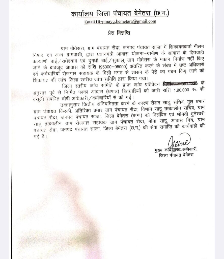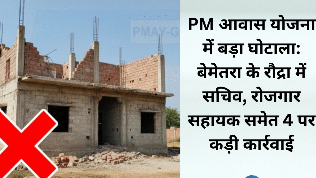 PM आवास योजना में बड़ा घोटाला: बेमेतरा के रौद्रा में सचिव, रोजगार सहायक समेत 4 पर कड़ी कार्रवाई