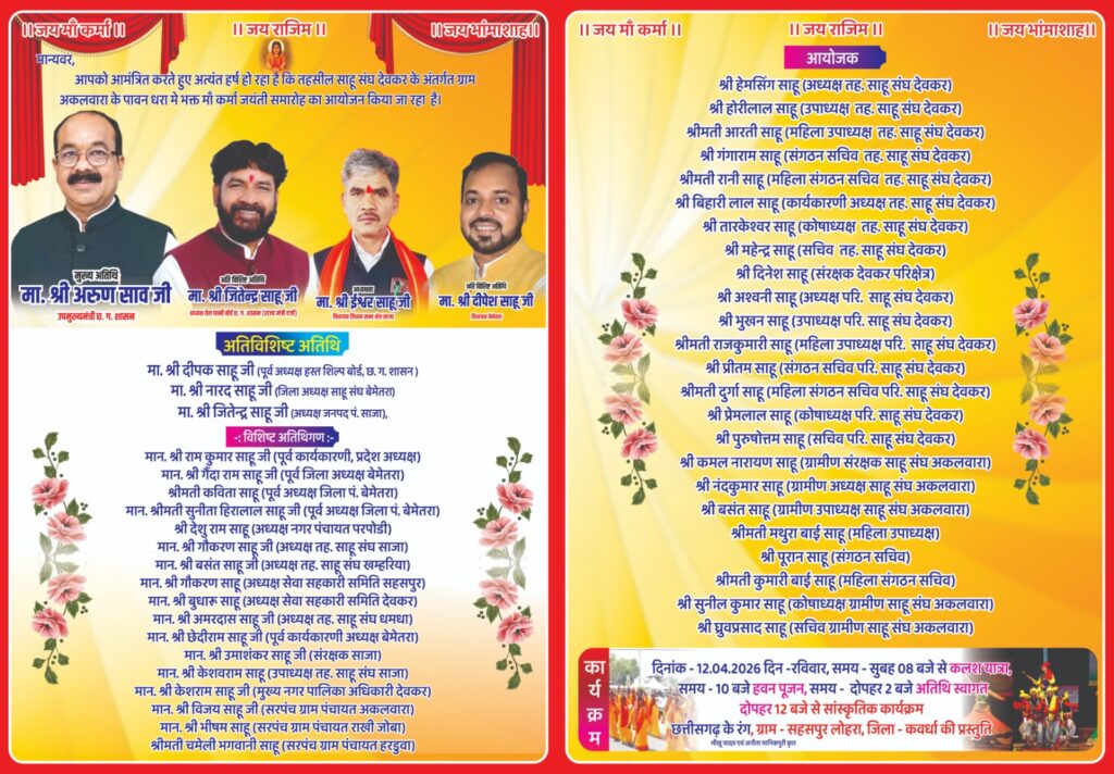 बेमेतरा। तहसील साहू संघ देवकर के तत्वावधान में आगामी 12 अप्रैल 2026, रविवार को ग्राम पंचायत अकलवारा (जिला बेमेतरा) की पावन धरा पर ‘माँ कर्मा उत्सव, आदर्श विवाह एवं शपथ ग्रहण समारोह’ का भव्य आयोजन होने जा रहा है। इस गौरवशाली आयोजन में समाज के दिग्गज राजनेता और पदाधिकारी शिरकत करेंगे।